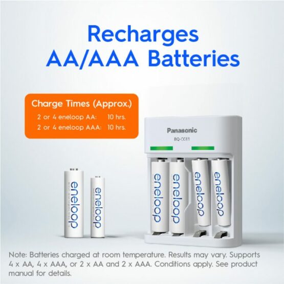 The eneloop BQ-CC61TA Battery Charger features a convenient DC In USB Port, giving you the freedom to charge your eneloop or eneloop PRO Rechargeable Batteries from virtually any USB power source.